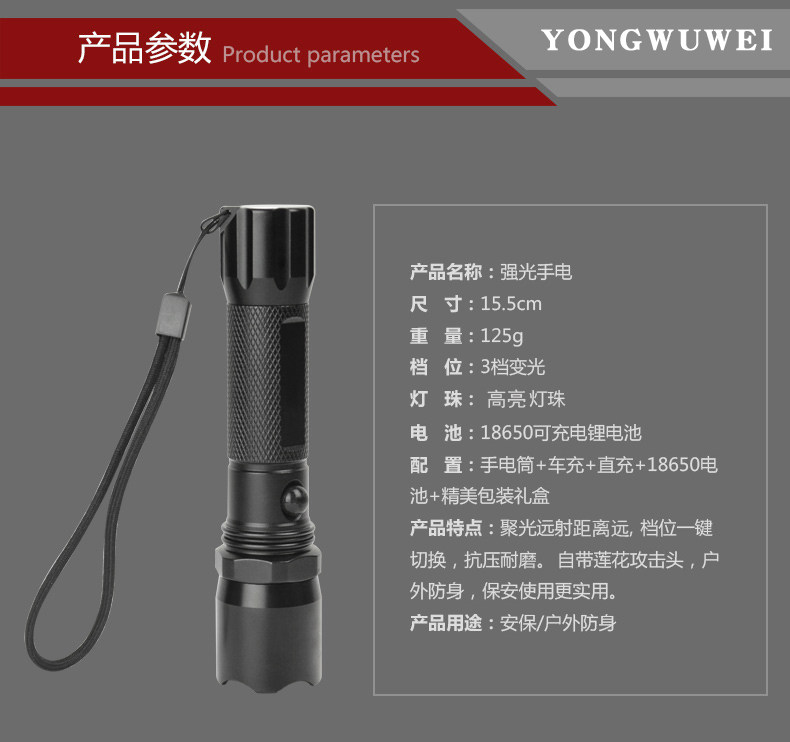勇无畏强光手电筒可充电式远射户外便携防身超亮耐用家用战术灯